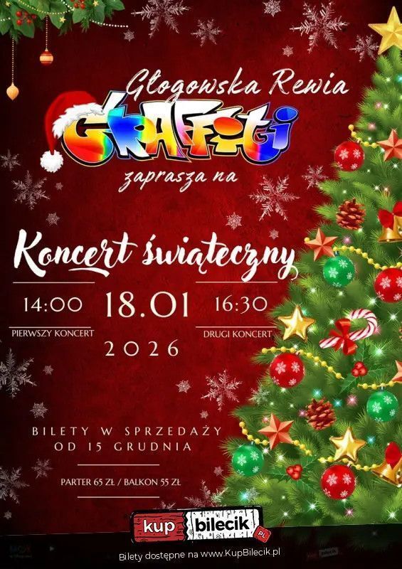 Głogowska Rewia Graffiti przygotowała widowisko taneczno-muzyczne z barwnymi choreografiami, kolędami i pastorałkami. Dzieci i młodzież z Graffiti na scenie wspierać będą zaproszeni muzycy i absolwentki rewii. Koncert będzie sentymentalno-muzyczną podróżą po świąteczno-noworocznych klimatach - podróż w której dzieci, młodzież, rodzice i seniorzy/dzień babci i dziadka/ znajdą coś dla siebie i spędzą miły czas z rodziną i rewią Graffiti.